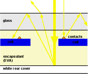 組件中稀疏地封裝太陽電池,空白的面積也可以因為“零深度聚光效應”而增加組件的輸出。如下圖所示,某些照射到組件中空白區(qū)的光被反射和散射到太陽電池的表面。