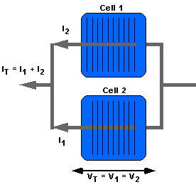 并聯(lián)聯(lián)接的太陽電池。相互并聯(lián)的太陽電池上的電壓總是相同的,并且總電流是各個獨(dú)立太陽電池電流的和。